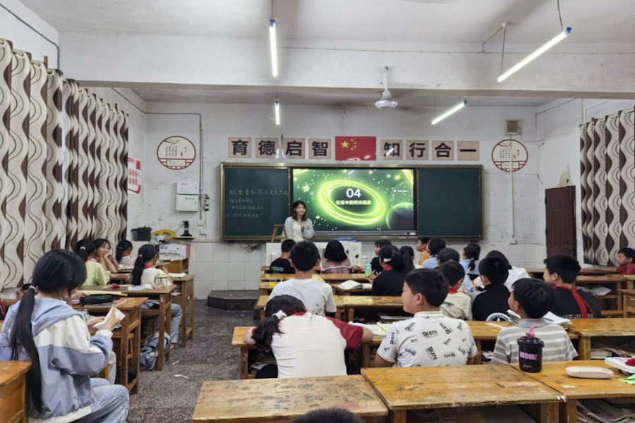 7月2日,团队面向3至6年级学生开展“树立梦想与目标”主题特色课程。针对乡村儿童普遍存在的目标模糊、学习动力不足等问题,团队以“梦想阶梯”为核心工具,设计“概念解析—方法传授—实践训练”全链条课程。志愿者通过“爬楼梯”互动问答,引导学生理解目标分解的意义,并结合“太阳与台阶”的比喻,用板书口诀强化记忆。课堂上,学生踊跃发言,在小组互助中互评目标可行性,提出“设闹钟+贴便利贴”等具体解决方案,展现出从“知”到“行”的转变。团队还注重课程实效性,课程尾声,志愿者带领学生进行课堂宣誓:“小目标,大梦想!本周我一定能行!”通过“宣誓承诺+每周涂色打卡”的趣味形式,带领学生进行课堂宣誓,宣读本周目标,并将阶梯图贴于书桌旁,完成目标后进行涂色。