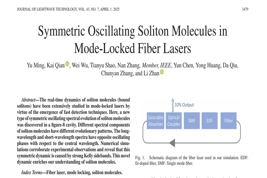 4月1日,我校智能科学与工程学院光电信息科学与工程专业2021级学生明雨以第一作者身份在中国科学院一区Top期刊(2023年中国科学院文献情报中心期刊分区表)《光波技术杂志》(《Journal of Lightwave Technology》)(影响因子4.1)发表了题为《锁模光纤激光器中的对称振荡孤子分子》(“Symmetric oscillating soliton molecules in mode-locked fiber lasers”)的学术论文。