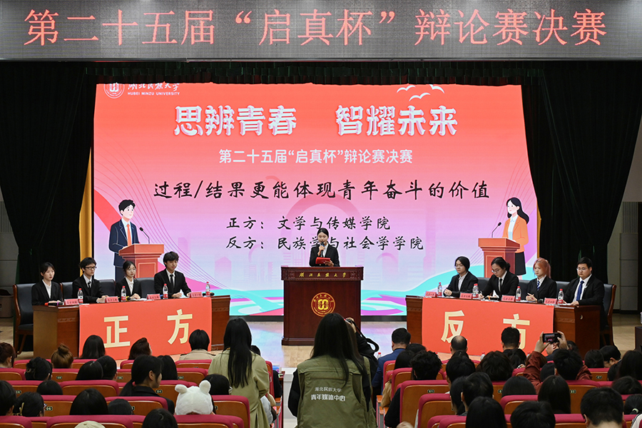 4月10日,365电子娱乐官方网站第二十五届“启真杯”辩论赛决赛暨颁奖典礼在行政楼一号会议室举行。经过初赛、复赛和半决赛的紧张角逐,正方文学与传媒学院与反方民族学与社会学学院进入决赛。决赛现场,正方双方围绕“过程/结果更能体现青年奋斗的价值”这一辩题展开激烈的辩论。决赛现场比赛分为开篇立论、质询、自由辩论等六个环节。文学与传媒学院从“过程是流动的轨迹,结果是凝固的坐标”“奋斗是为了某个目标持续付出的努力”“...