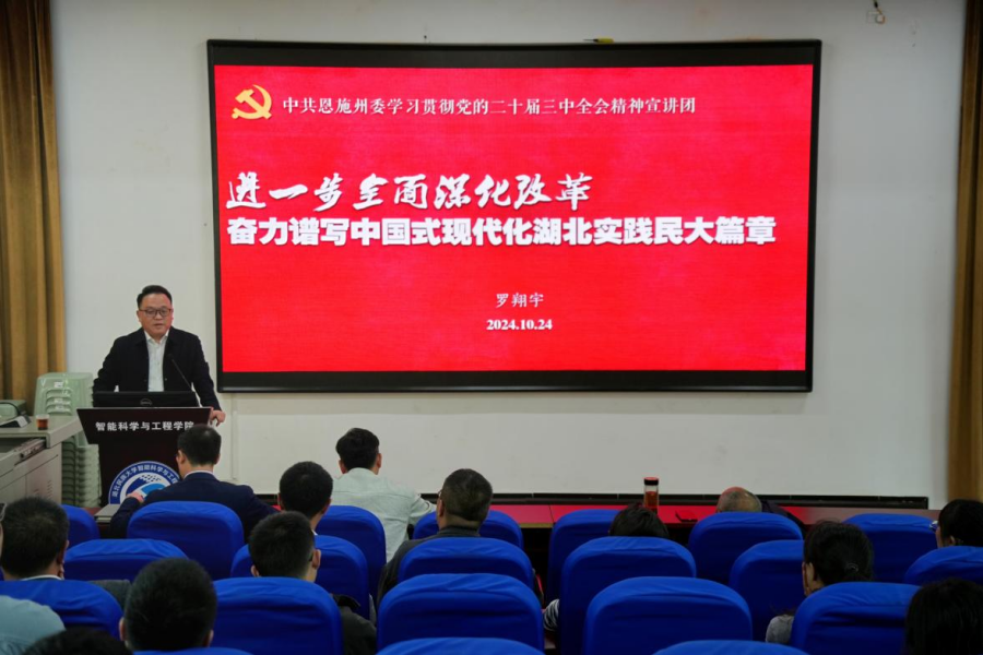 为深入学习贯彻党的二十届三中全会精神,进一步统一思想、凝心铸魂,10月24日下午,智能科学与工程学院邀请学校党委宣传部常务副部长罗翔宇作学习贯彻党的二十届三中全会精神宣讲。智能科学与工程学院党委书记孙先波主持宣讲会,学院全体教职工聆听宣讲会。宣讲现场罗翔宇结合党的二十届三中全会重要精神,以《进一步全面深化改革——奋力谱写中国式现代化湖北实践民大篇章》为题,他通过“大历史观”对中华文明上下五千年的发...
