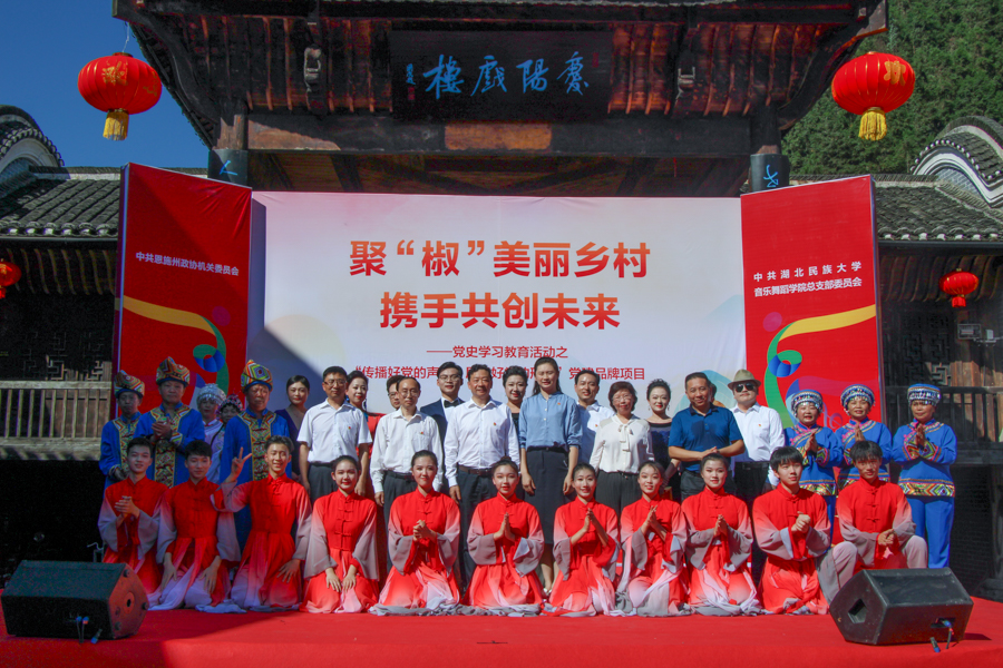 活动现场本网讯(通讯员 单家迪/文 记者 韦雨欣/摄)9月30日,我校音乐舞蹈学院联合州政协机关前往宣恩县椒园镇庆阳坝村送文艺下乡,开展党史学习教育。州政协党组书记、主席吴建清,党组副书记、副主席张全榜,副主席刘晓冰出席,州政协职工及我校音乐舞蹈学院师生共80余人参加活动。吴建清致辞吴建清致辞。他表示,驻村工作队要落实农业农村优先发展的方针,把庆阳坝村建设成“产业兴旺、生态宜居、乡风文明、治理有效、生活...