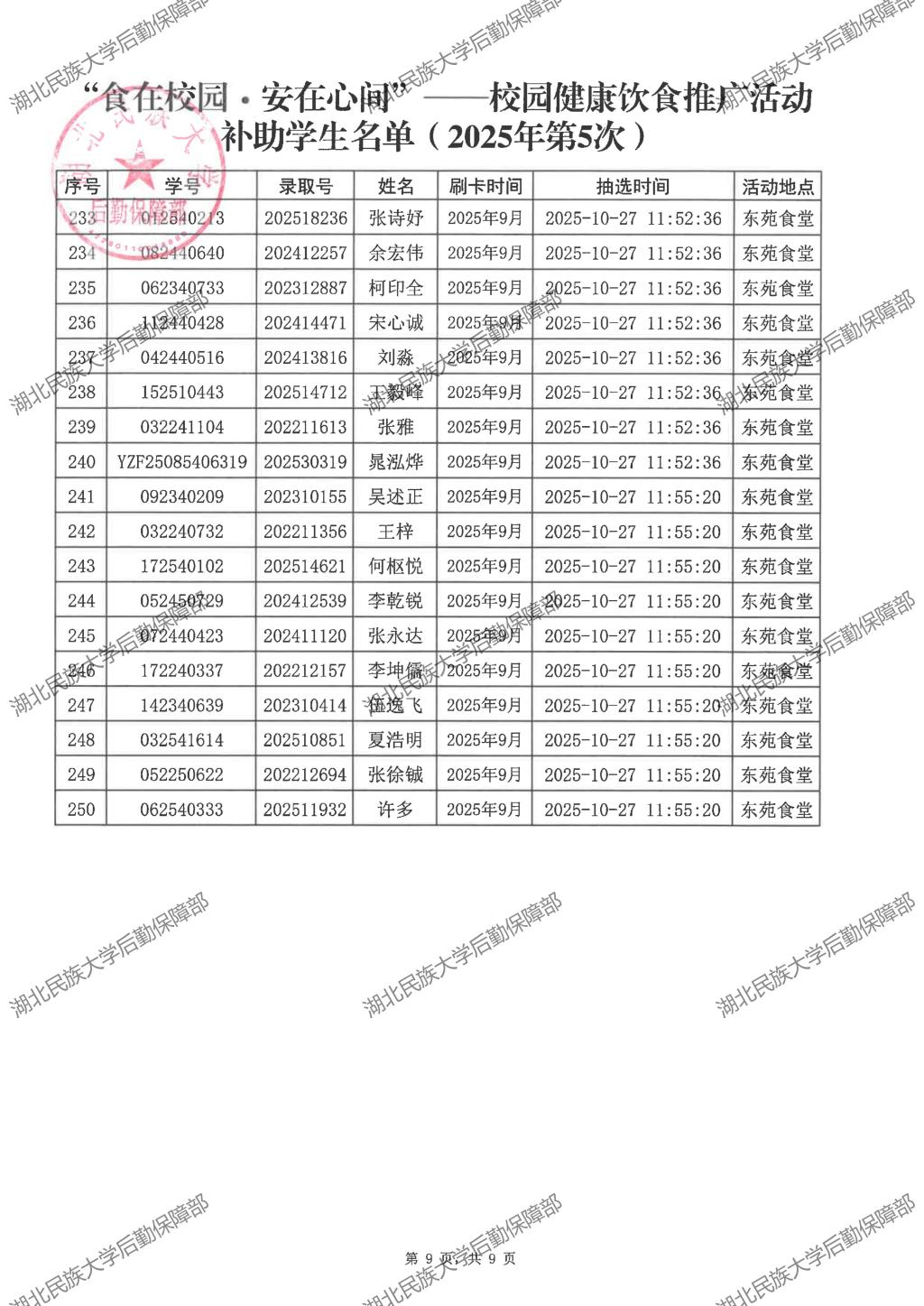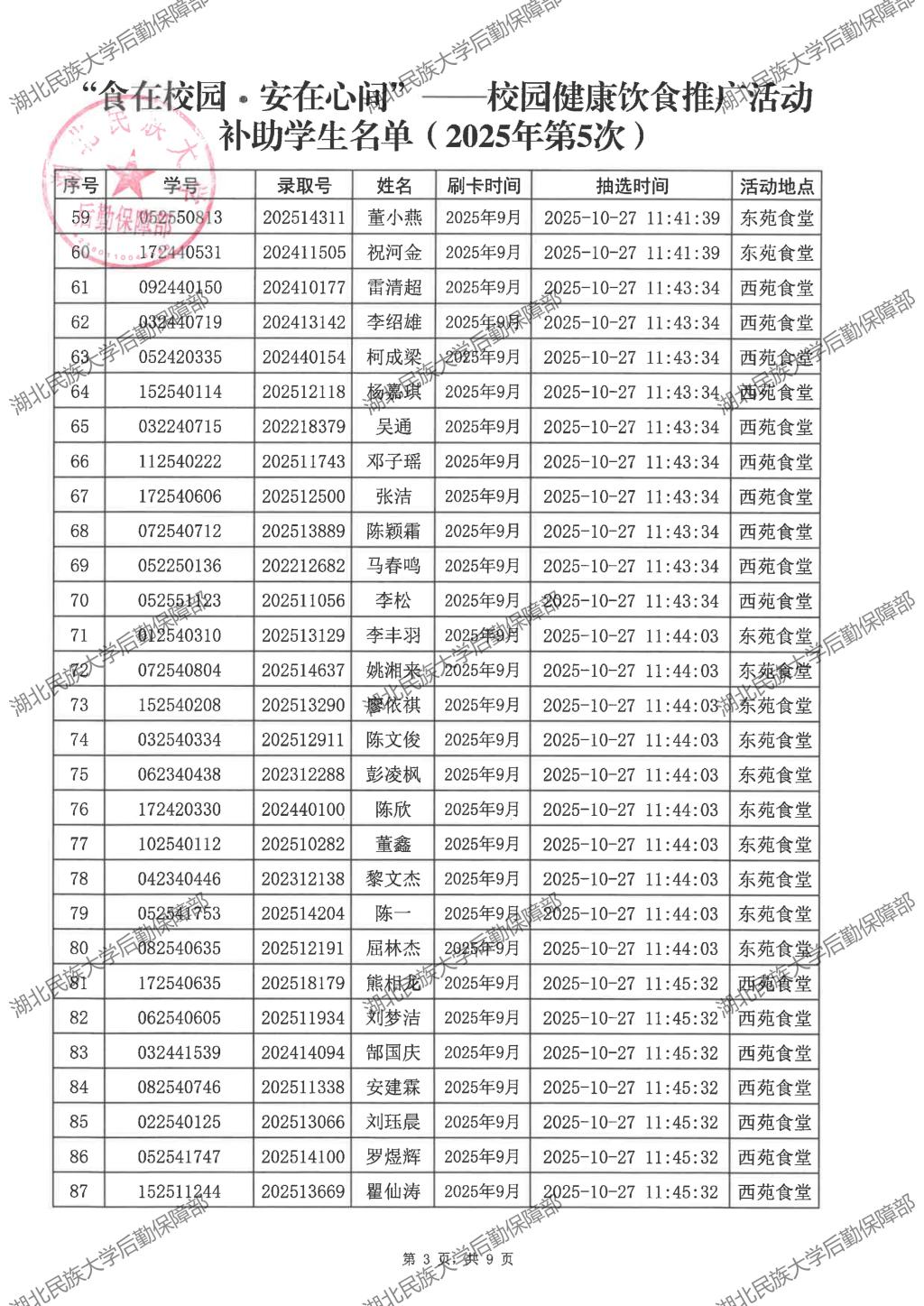 “食在校园·安在心间”——校园健康饮食推广活动(2025年第5次)补助学生名单公示