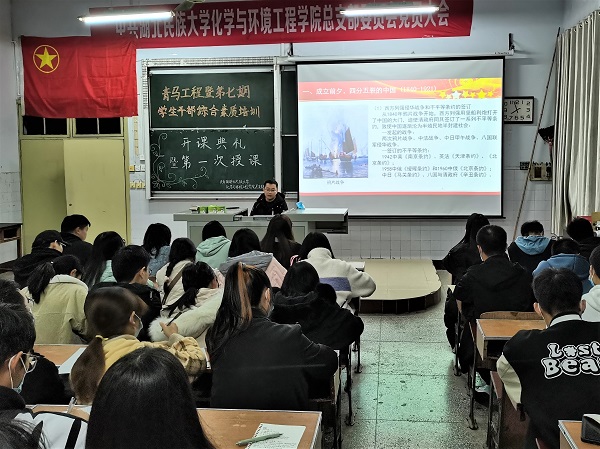 本网讯(通讯员 许智玮 李洁瑜 周晓雨/文 杨艳秋 王允/图) 11月7日,我院在2207教室开展2021年度青马工程培训班开课典礼暨第一次授课。我院学生科副科长张艺馨,团总支书记刘恒,学生科辅导员覃昕、彭召元出席此次活动。校团委、二级学院组织纪检部成员及全体青马工程学员参加。