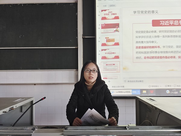 授课伊始,覃昕提出以史为鉴,可以看成败、明得失、知兴替。而后从“学习党史的意义、党的发展过程、党员干部应永葆四种本色、廉洁永远在路上”这四个方面展开授课。在学习党史的意义中她强调“学党史有助于增强道路自信、理论自信、制度自信和文化自信。要在学习的过程中认识到身为党员贪污腐败对人民会造成巨大的危害”。接着,她介绍了党员干部应当永葆的四种本色:忠诚本色、为民本色、担当本色、干净本色。她认为要始终做到心中有党、心中有民、心中有责、心中有戒,不断丰富自己的历史知识,开阔眼界和胸襟,提升认识能力和精神境界,才能成为一名合格的党员干部。随后,她带领学习《永远在路上》,并以聂春玉,苏荣和部分贪腐干部为例子,让学员和发展对象深切认识到身为干部,保持廉洁,反对腐败贪污的重要性,指出党员干部要树立正确的权利观、地位观、利益观。最后她谈到:贪如火,不遏则自焚;贪如水 不遏则自溺。她希望全体学生能够以谨慎之心对待权力,以淡泊之心对待名利,以警惕之心对待诱惑。精心谋事,潜心干事,坦荡处事,谨慎行事,勇敢的朝着自己的初心前行。