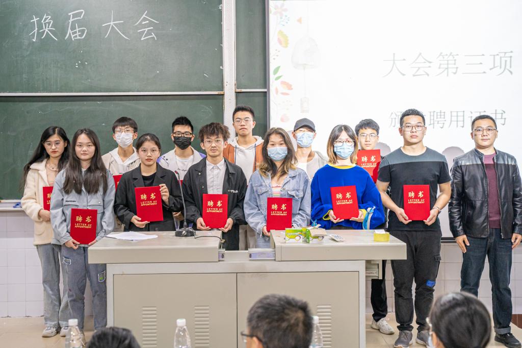 党总支副书记刘应煊为我院2021-2022学年度团学主席团成员、通讯社社长、副社长颁发聘书及纪念品并合照。