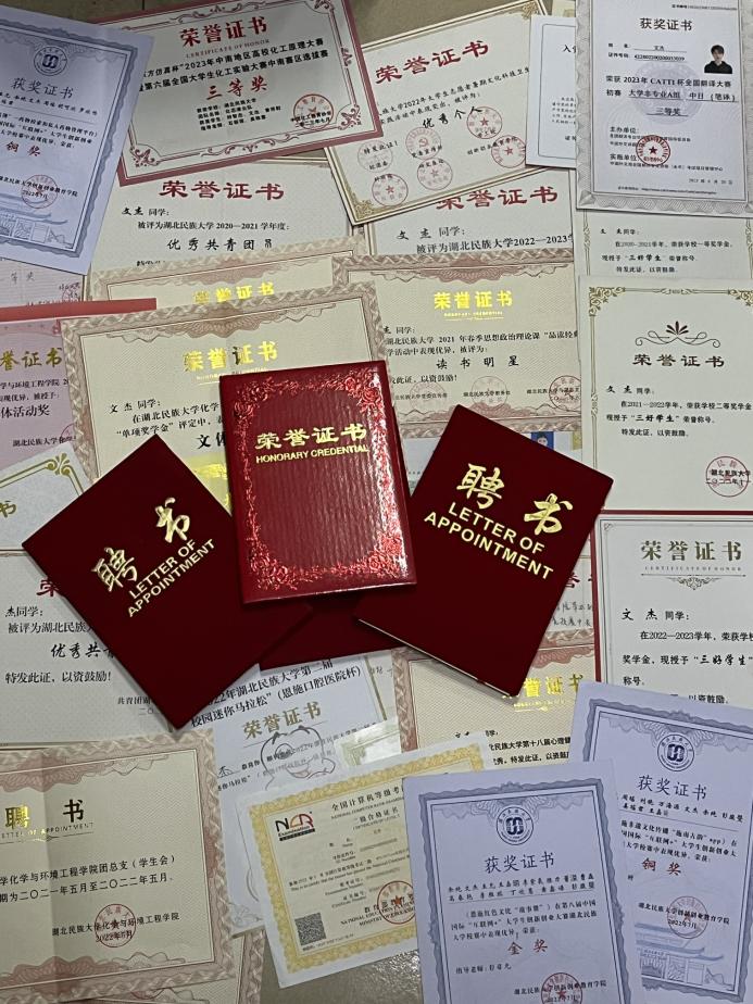 文杰,男,中共预备党员,湖北利川人,我院2020级化学工程与工艺专业学生。曾获2023年CATTI杯日语组全国三等奖,第六届化工实验大赛中南赛区三等奖,第八届“互联网+”大学生创新创业大赛金奖一项、铜奖两项,第九届“互联网+”大学生创新创业大赛金奖一项、银奖一项、铜奖一项,2020-2021学年校级一等奖学金,2021-2022学年和2022-2023学年校级二等奖学金,2022年我校暑期社会实践“优秀个人”荣誉称号,2020-2021学年、2021-2022学年、2022-2023学年“优秀共青团员”荣誉称号;曾任我院团总支宣传部副部长、通讯社摄影部部长、通讯社副社长。现已考取延边大学硕士研究生。