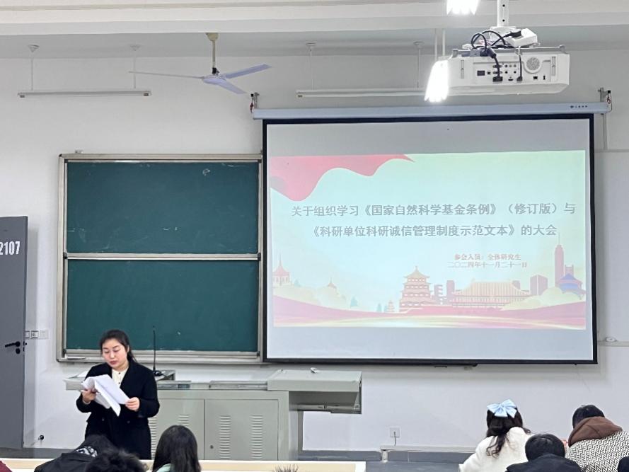 11月21日,为了加强科研人员对国家自然科学基金条例与科研诚信相关条例的学习,提升科研道德水平,一场意义非凡的科研诚信学习活动在化学与环境工程学院2107教室隆重举行。我院全体研究生参加此次活动,辅导员蒋筑阳老师担任主持人。