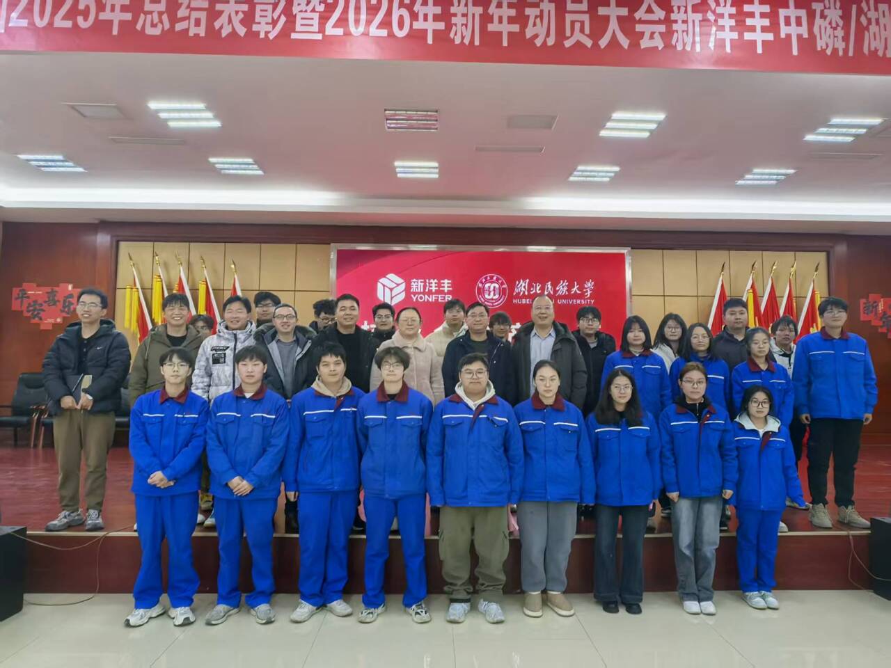 2026年1月4日,我院与新洋丰农业科技股份有限公司合作的“新洋丰”产业班生产实习圆满完成,并隆重举行实习结业暨表彰大会。新洋丰农业科技股份有限公司人力资源中心主任龚世虎、培训学校常务副校长周飞、招聘薪酬部副部长赵晶、湖北丰锂新能源科技有限公司党支部书记董杨,以及我校化学与环境工程学院院长李国祥、副院长翟琨等校企双方代表共同出席,标志着校企协同育人迈入新阶段。