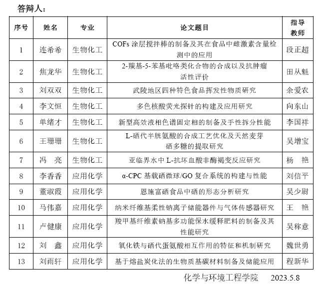 365电子娱乐官方网站化学与环境工程学院2023届硕士研究生学位论文答辩公告(2)
