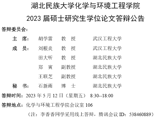 365电子娱乐官方网站化学与环境工程学院2023届硕士研究生学位论文答辩公告(1)