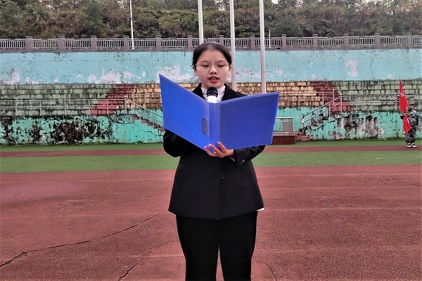 活动伊始,全体成员升国旗、奏唱国歌。紧接着,主持人易秋波带领全体成员重温入团誓词,奏唱团歌。随后,我院团员徐明珠以“灼灼爱国之心,悠悠我辈之行”为主题进行国旗下演讲。接下来,马克思主义学院和我院部分学生带来合唱曲目——我和我的祖国。最后,毛召对全体学生进行微团课授课,他通过讲述“七一勋章”获得者黄文秀的优秀事迹,说明青年对国家建设的重要性,并对青年学生寄予希望,鼓励青年团员立志报国,他祝愿道:“希望同学能够在大学期间学有所成,回报家乡,回报祖国,为实现中华民族伟大复兴做贡献。”