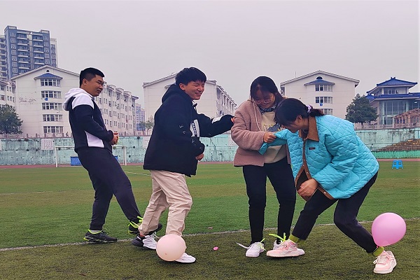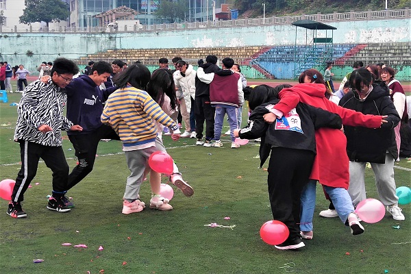 此次活动分为三个部分,个人赛“指压板跳绳”“原地向上颠乒乓球”,小团体赛“踩气球”“青蛙跳”“盲人背瘸子”,大团体赛“长杆跑”“趣味接力赛”。在比赛中,最受欢迎的项目是踩气球,比赛将两人三足和踩气球完美结合,参赛者两两相互配合,进攻同时还不忘防守,气氛时而紧张,时而欢愉,最后,在参赛者的欢声笑语中结束了比赛。最具刺激性的项目是长杆跑,由8到12人行成一排,进行一个8字型跑动,长杆两端的参赛者体验了飞驰的速度。
