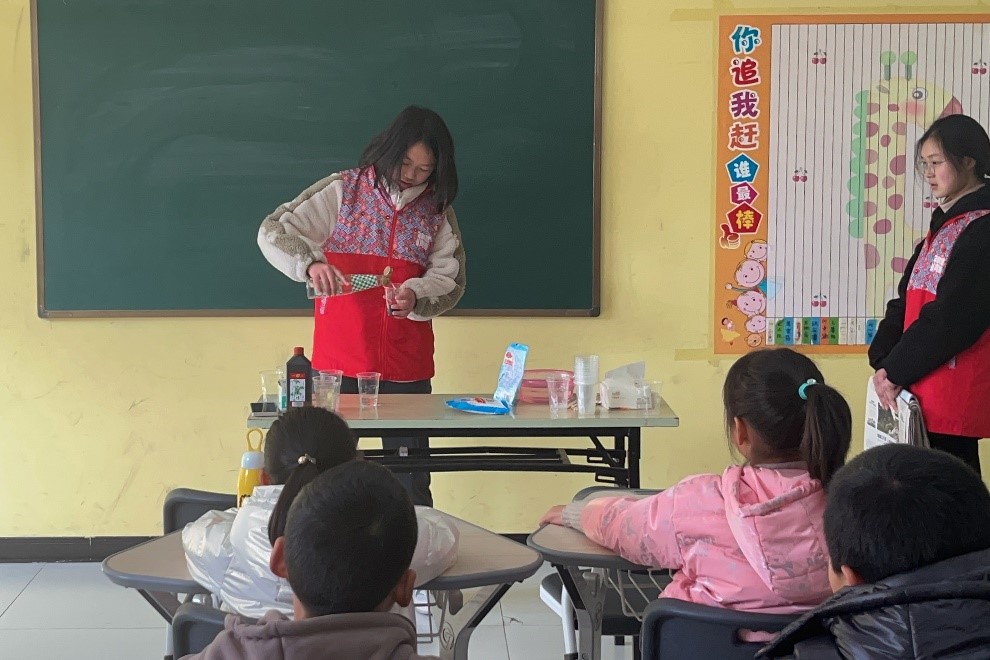本次志愿活动分为“了解化学生僻字”“淘气的小纸团科学实验”和“大象牙膏科学实验”三个环节。活动伊始,社长按年级将小朋友分为两个班,并进行不同实验。伴随着歌声,志愿者在黑板上整齐利落的写下元素周期表里的生僻字,并解释生僻字所代表的元素及特殊含义,带领小朋友们走入化学。在“淘气的小纸团科学实验”环节,志愿者用小游戏热场后,亲自给小朋友们示范实验流程。稍后,在小朋友们自己动手时,他们发现在洗洁精水里的纸团比普通水里的纸团下沉更快,志愿者们解释这是因为洗洁精破坏了水的表面张力,使得纸片更容易吸收水分,从而更快地下沉。接着,小朋友们举一反三,结合自身实际积极回答生活中见到的表面张力现象。在“大象牙膏科学实验”环节中,小朋友们围成一圈,看着志愿者一步步加入水、小苏打、白醋以及少许墨水后不停搅拌,黑色泡沫从塑料杯中喷出,就像大象的长鼻子一样,小朋友都发出惊呼并十分兴奋。在操作过程中,小朋友们跃跃欲试,都怀着高涨的热情,期待自己的“大象鼻子”成功出现。最后,志愿者鼓励小朋友们积极观察生活中的点点滴滴,多多留心,日常生活中处处蕴含着科学的秘密。
