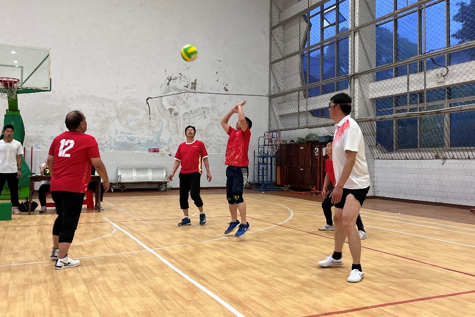 时近傍晚,体育馆里却是热情高涨的人群。裁判示意比赛开始后,面对对方的发球,男老师纵身一跃、将球反扣出去,动作间尽显运动力量和竞技精神;女老师巾帼不让须眉,她们对球托举、抛出,手臂一挥,空中便划过一道优美的弧线。