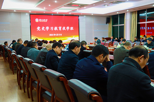本网讯 4月15日晚,我校正处级以上领导干部党史学习教育读书班在行政楼3号会议室进行集中夜学,校领导及全校正处级以上干部参加学习。