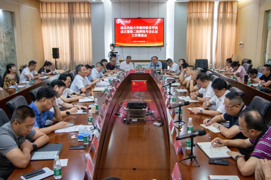 教师教育学院党总支书记刘际华作表态发言。据了解,下一阶段,学校将按照“学校统筹,学院主导,专业主体,全员参与”的工作思路,推动英语、物理学、化学、体育、思想政治教育五个专业师范认证工作分阶段发展。教师教育学院党总支副书记谭华安排部署了第二批师范专业认证工作。第二批参加师范专业认证的学院院长依次表态发言。