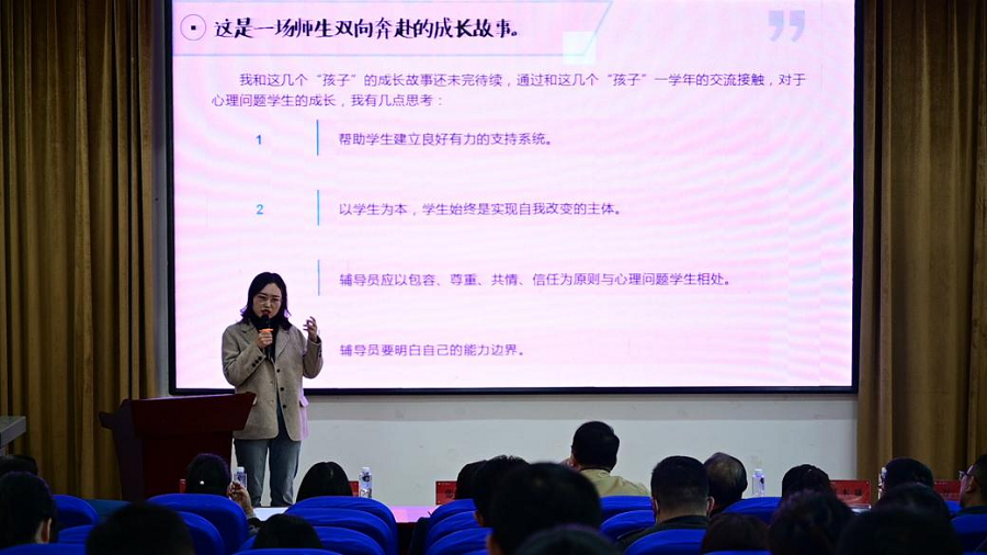 党委宣传部常务副部长罗翔宇在比赛结束时分享了自己的心得。他用“育人”“故事”“分享”三个关键词高度评价了参赛选手的表现,指出育人要知行合一、故事要见微知著、分享要情理交融。他表示,新时代的学生工作需要有热爱教育的定力、立德树人的能力、以心换心的动力。