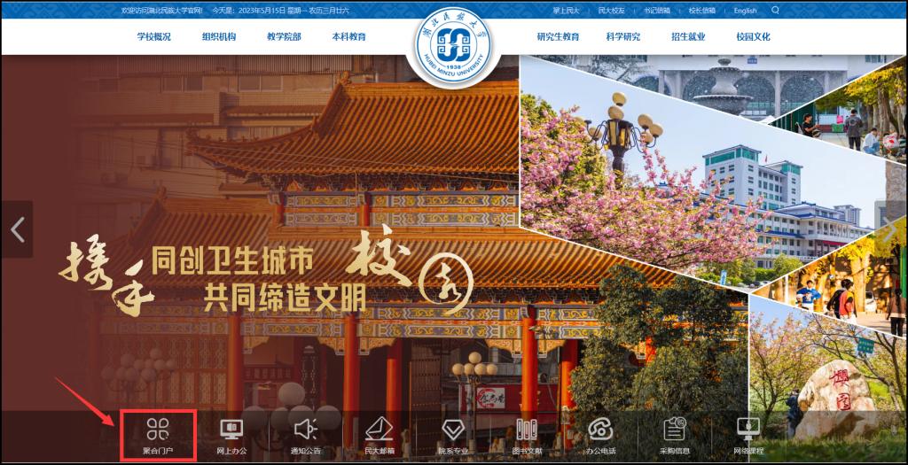 打开学校官方网站(),点击“聚合门户”图标,使用统一身份认证账号登录;