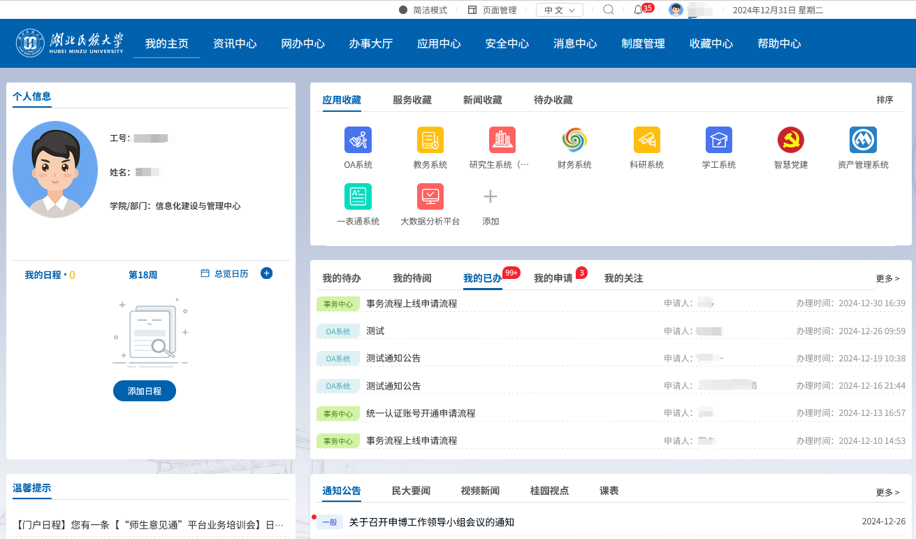 根据《365电子娱乐官方网站推进数据治理和“一网通办”工作实施方案》(民大校办发〔2024〕50号)的相关要求,为方便师生一站式访问学校各业务系统,推进“一网办、一门办、掌上办”,学校“聚合门户”平台统一了各业务系统的访问入口,集成了信息查询、数据填报及业务办理等各类智慧服务。