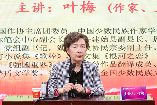 讲座伊始,叶梅谈到,她的到来是为鄂西人民“履职”,作为“恩施的女儿”,她希望可以报效鄂西地区,传播乡愁文化。随后,叶梅作文学报告,她指出文学是记录善、鞭打恶的艺术。在提及民族文学时,她表示自己早期文学创作是对民族文学的解读,她呼吁文学创作者需肩负起保护民族文学、唤醒民族意识以及促进民族团结的重任。同时,她以自己的作品《五月飞蛾》中农村女青年进入城市不断奋斗的故事为例,提出经典文学作品永不过时、值得每一代人学习的观点。