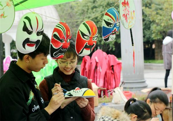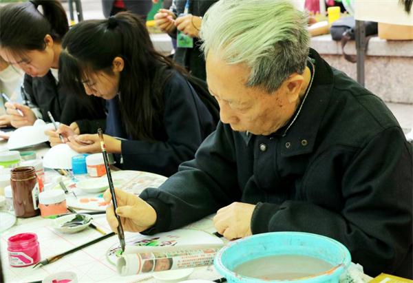 夜幕降临,工作人员悬列展示白天参与者所画优秀作品。在霓虹灯映照下,菊花盆栽、书画、团扇脸谱交相辉映,焕发出异于白天的别样光彩。更多学生被吸引过来,纷纷驻足拍照,现场俨然成为一场艺术文化与自然风光相结合的视觉盛宴。“作品中央的盆景展览最令人惊叹,在灯光下显得格外美丽和出众。”现场观众崔航说道。