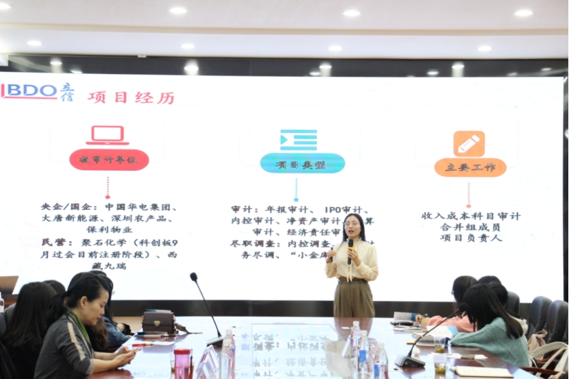 孙慧莹作介绍,她从自己加入立信会计事务所的初心、能力要求及职业规划建议等五方面展开叙述。她在讲解立信对员工能力要求的同时分享自己的工作经验与收获,她表示,通过在立信工作,不仅可以在事业发展方面积累丰富的审计经验、提高专业能力,还可以在综合素质方面提升沟通交流能力。最后,她希望学生能够考取CPA证来增强自己的专业能力,尽可能丰富学历以增加就业几率。
