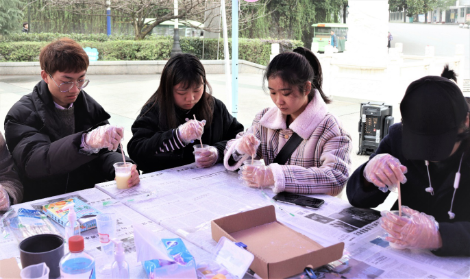 此次活动划分为“疫情的色彩”“洗走细菌,共战疫情”“疫识袋袋传”三个项目站点。在“疫情的色彩”项目站点,参与者可通过参与防疫小知识答题活动了解新冠疫情相关知识并通过答题领取相应奖品。参与者可在“洗走细菌,共战疫情”项目中由志愿者陪同制作一瓶洗手液作为纪念。该项目让参与者得以了解制作洗手液的基本流程。在制作过程中,志愿者耐心解答参与者提出的问题并及时提供帮助,现场气氛融洽。学生可在“疫识袋袋传”项目站点领取免费快递袋,该项目站点志愿者帮助学生对快递进行消毒并重新打包。