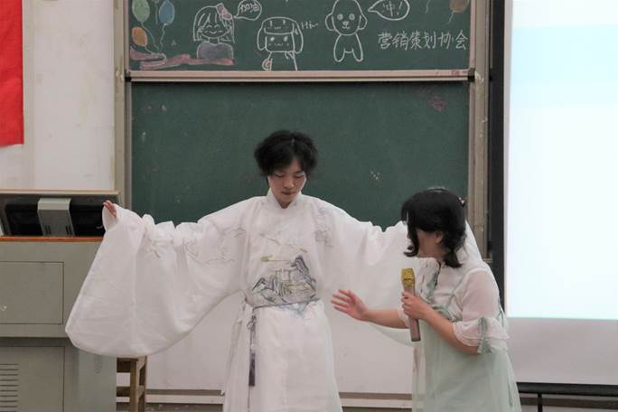 比赛共有“报告答辩”“现场推销”两个环节。在“报告答辩”环节中,各选手展示推销产品的PPT后,评委老师提问并点评。二号选手邵凌漪通过详细的数据调查和对现有模式不足的分析,为西苑五食堂作出切实可行的发展计划。三号选手石傲、谌浪通过调查小饰品在学生中受欢迎的程度来解读时尚文化。同时,他们邀请模特进行样品展示,不仅诠释“饰”界因你而精彩的主题,而且增加了现场观众对饰品的直观感受。在“现场推销”环节中,选手需要就各自的推介产品进行现场推销。三号选手通过模特走秀以及现场为观众、评委推销实物的方式展现产品魅力;五号选手对汉服进行展示介绍,凸显传统汉服之美。