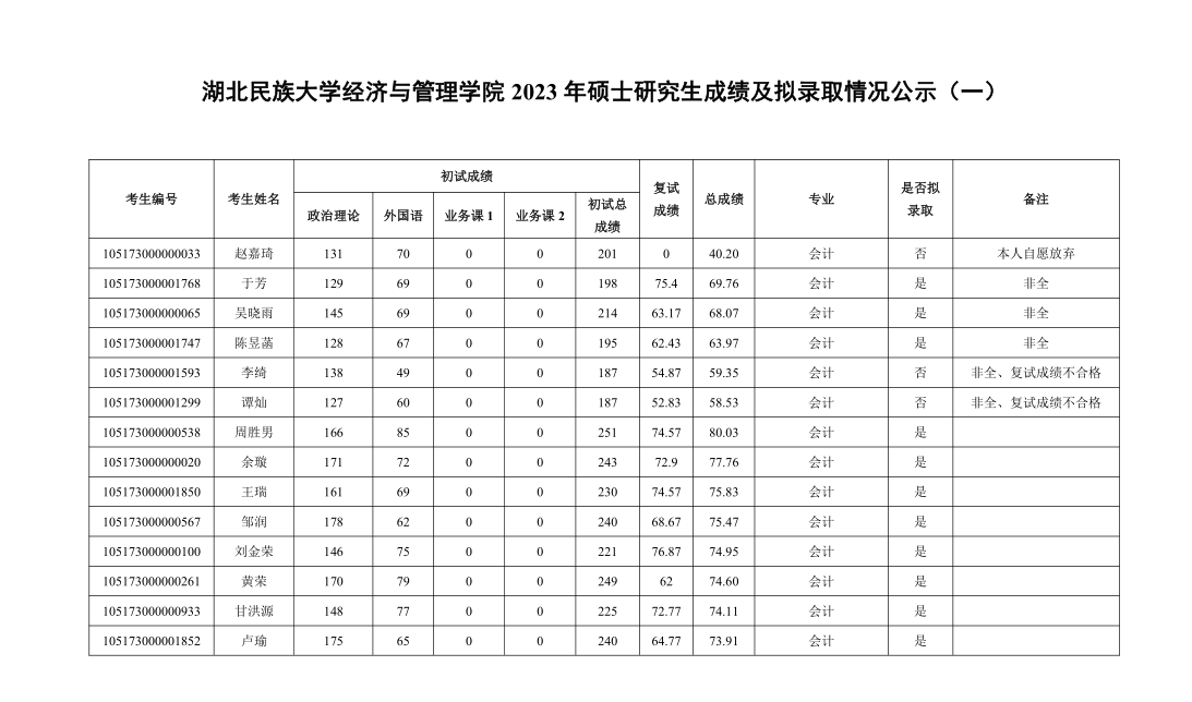 365电子娱乐官方网站经济与管理学院 2023 年硕士研究生成绩及拟录取情况公示(一)