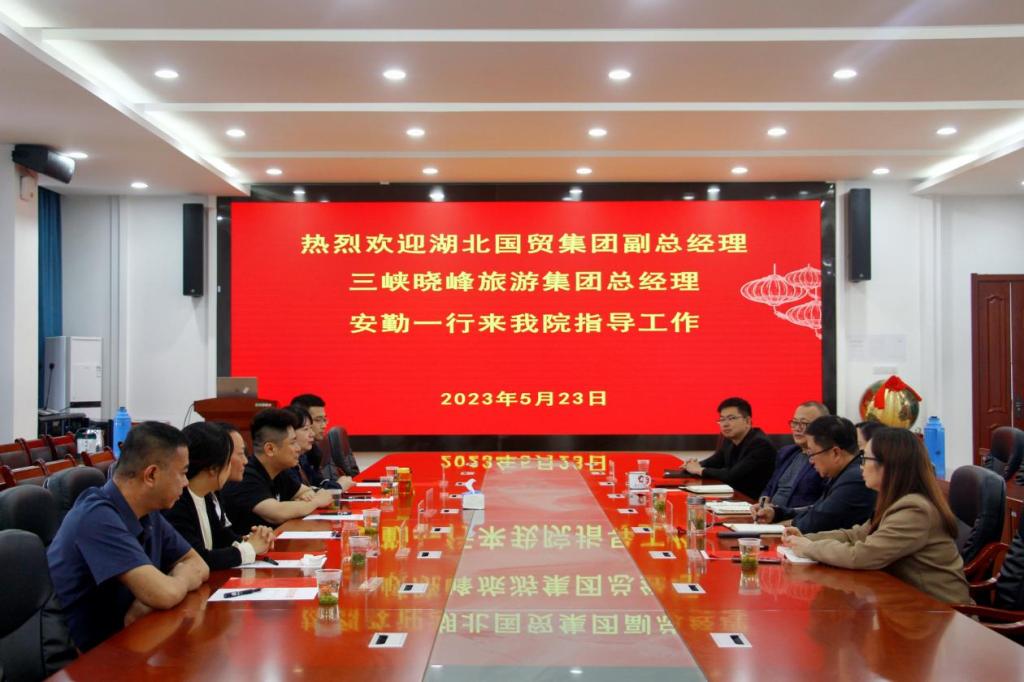 本网讯(记者 杨兆佳 穆语恒/文 毛庆颖/图)2023年5月23日,湖北国贸集团副总经理、三峡晓峰旅游集团总经理安勤一行到经济与管理学院洽谈合作事宜,并在经管楼附303会议室举行会议。湖北国贸集团副总经理、三峡晓峰旅游集团总经理安勤,三峡晓峰旅游集团副总经理毛越康、吴燕凌、陈丽华,财务总监赵希阳,市场总监王军。经济与管理学院党委书记陈霞,院长张新平,学生科科长曹骞,旅游系主任王俊平应邀出席。经济与管理学院副院长谭志喜担任主持人。