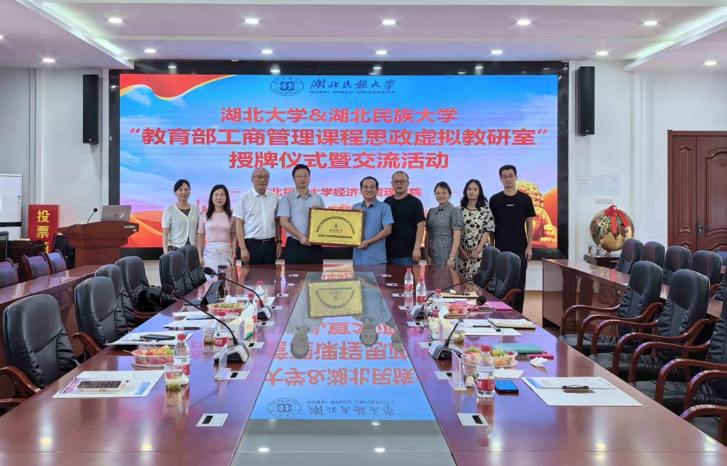 7月24日,湖北大学商学院院长程时雄教授,副院长王鸾凤教授,郭志文教授,教育部工商管理课程思政虚拟教研室主任、湖北大学商学院叶红春教授莅临我院并授予我院教育部工商管理课程思政虚拟教研室成员单位。经济与管理学院副院长谭志喜、冉瑞恩,学院办公室、学科建设科相关人员参加了授牌仪式及交流活动。