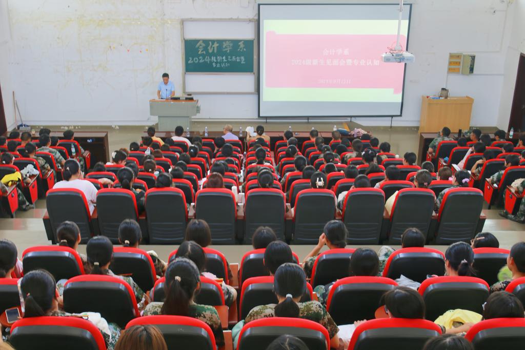 本网讯(记者 刘庆怡/文 肖雅轩/图)2024年9月12日,经济与管理学院会计学系联合“一站式”学生社区举办的2024级新生见面会暨专业认知教育大会在修远楼5B403报告厅隆重举行,经济与管理学院党委书记陈霞、教务处副处长朱廷辉、会计学系全体教师及2024级全体新生参加本次会议。会计学系主任刘洁玫担任本次会议主持人。