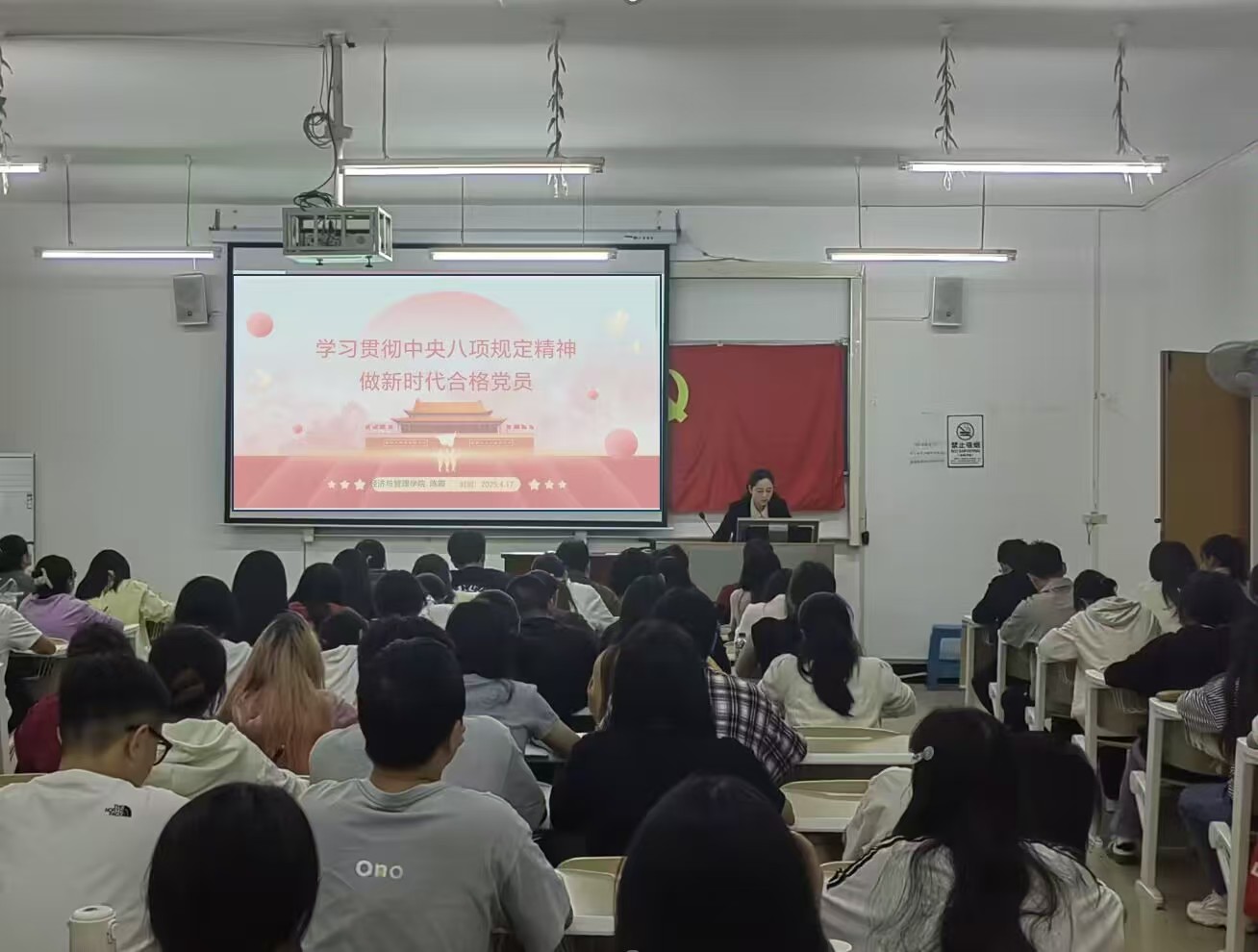 本网讯(记者 郭佳/文)2025年4月17日,经济与管理学院党委书记陈霞以《学习贯彻中央八项规定精神 做新时代合格党员》为主题的党课在文瀚楼附301教室举行。本次授课对象为我院2025年春季学期党员发展对象和入党积极分子。
