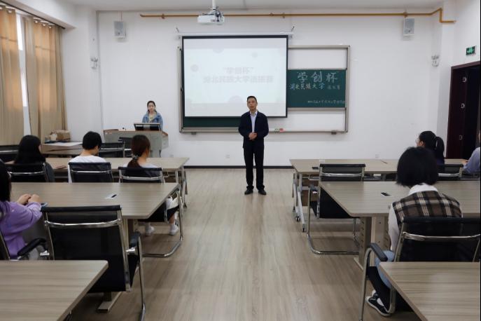 朱廷辉致辞。他首先介绍大学生实践中心是为学生提供创新创业机会、营造良好创新实践氛围的平台。同时,他表示“学创杯”比赛由湖北省教育厅主办、具有高含金量,指导老师对参赛学生进行创业技能培训,帮助学生了解模拟企业经营过程中的创新创业类知识。最后,他希望参赛团队培养合作意识、制定战略方针,将理论知识运用到实践中,在比赛中取得巨大突破。
