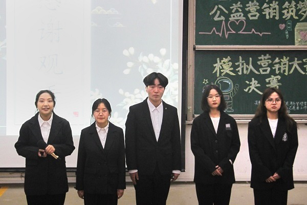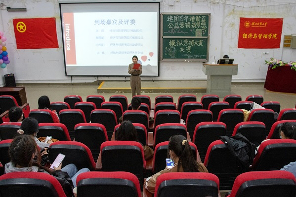在团队介绍环节中,“盆满钵满”队将差异化、成本领先、目标集聚作为竞争战略,形成自身产品特色;“卖到脱销”队以产品、市场和推销为导向,结合青年学生需求,从产品的颜值、质量和价格三方面提高产品吸引力。同时,四位评委分别对参赛队伍提出针对性建议。在现场营销环节中,“卖到脱销”队、“一生要强早八人”队、“盆满钵满”队通过展示其极具特色的商品进行现场营销活动。最终,“卖到脱销”队以8.9分摘得本次比赛桂冠。
