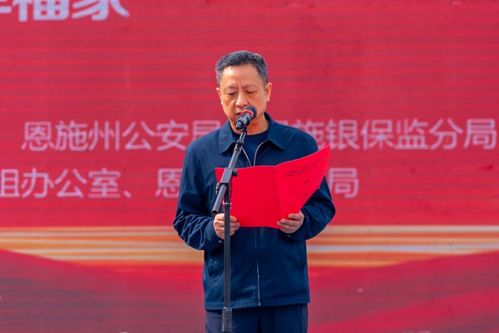 本网讯(记者 尚任毅 陈研 张涛/文 周隆宇/图)2023年5月15日,2023年恩施州、市防范非法集资宣传月暨打击和防范经济犯罪宣传月启动仪式在工人文化宫广场举行。本次活动由恩施州防范和处置非法集资工作领导小组办公室和恩施州公安局联合举办,活动主题为“守好钱袋子·护好幸福家”,恩施州地方金融工作局局长王牟、恩施州公安局政委杨斌、恩施州地方金融工作局副局长侯晓荟、恩施银保监分局副局长刘琼出席本次活动。恩施市副市长高仁海担任本次仪式主持人。