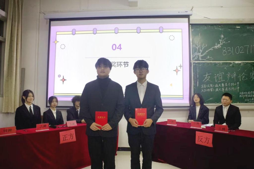 本网讯(见习记者 李如意 叶梦真 余佳怡/文 记者 张玉婷 见习记者 肖雅轩/图)为提高学生的思辨能力和语言表达能力,培养团队合作精神,切实加强校园文化建设。2023年12月15日,经济与管理学院联合文学与传媒学院举办的友谊辩论赛在文瀚楼附102教室举行。文学与传媒学院优秀辩手王珮伊、张秋瑞,经济与管理学院优秀辩手杨丽君、杨兆佳应邀出席本次比赛并担任评委。