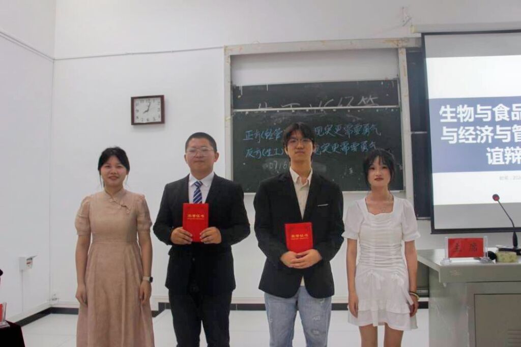 本网讯(记者 刘姝涵 罗爽/文 蔡甜甜 余佳怡/图)2024年5月14日,经济与管理学院联合生物与食品工程学院举办的友谊辩论赛在至真楼4202教室举行。生物与食品工程学院优秀辩手谭锦宏、王欢,经济与管理学院优秀辩手吴倩应邀出席本次辩论赛并担任评委。最终,正方三辩方琦和反方二辩王世哲荣获“优秀辩手“称号。