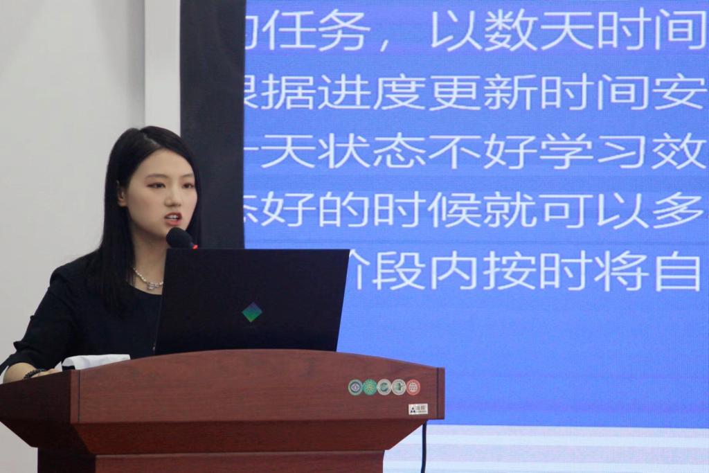 马婧宸作分享。她从时间规划及记忆学习两方面进行分享。她认为,学生在考研过程中需把好学习节奏,做到不骄不躁,以自信、乐观的心态全力备考。