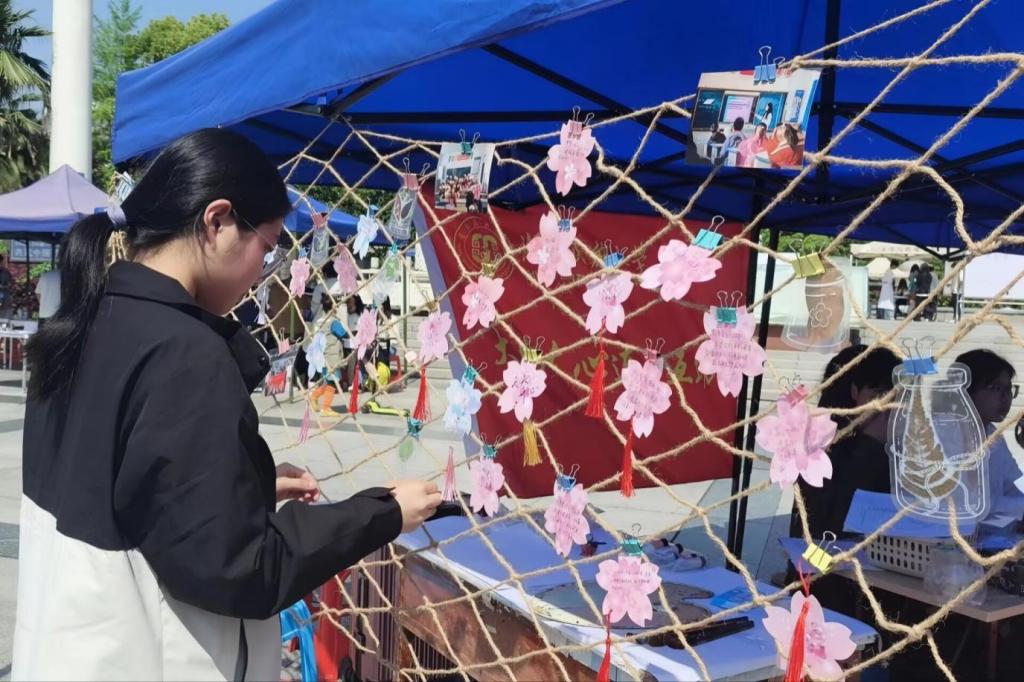 本次活动场地分为“蓝信封”“童年一课”“创意互动”三个区域。“蓝信封”主要通过志愿者与乡村儿童一对一通信的模式提供远程陪伴,以温暖纯粹的公益形态为乡村儿童传递关爱与支持;“童年一课”作为乡村线上支教专项公益项目,通过招募大学生志愿者为乡村小学教授美术、音乐与科学等素质课程的方式,助力弥补乡村素质教育资源的不足;在“创意互动”区域,学生在工作人员的引导下,以按压彩色手印、书写温馨寄语的形式,为乡村儿童送上真挚祝福,传递温暖能量,生动弘扬了共建共享、友爱互助的公益精神。