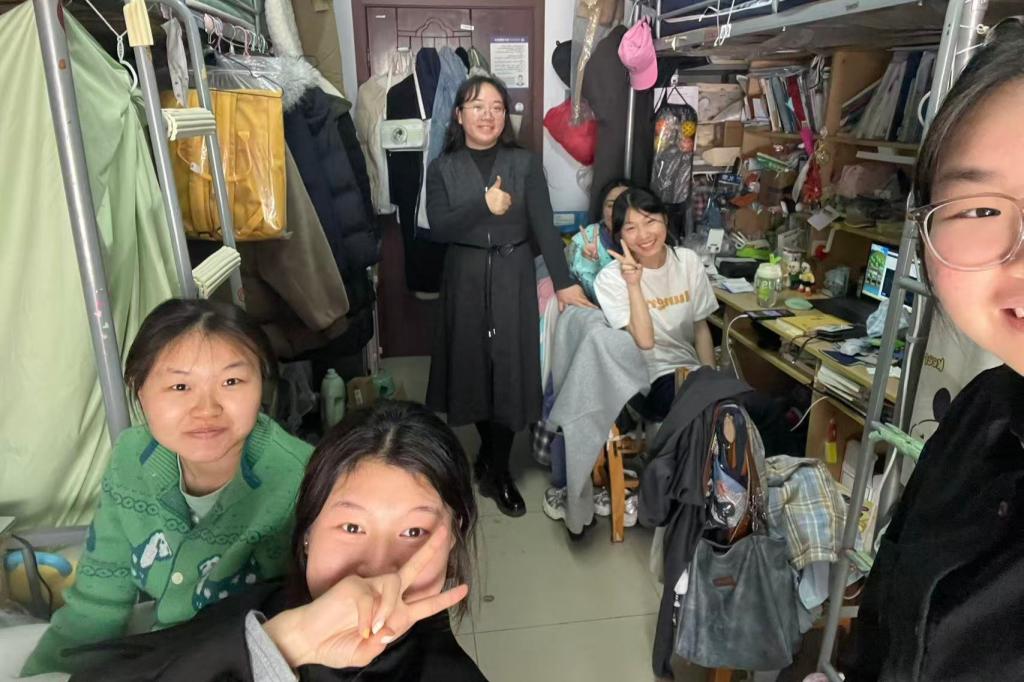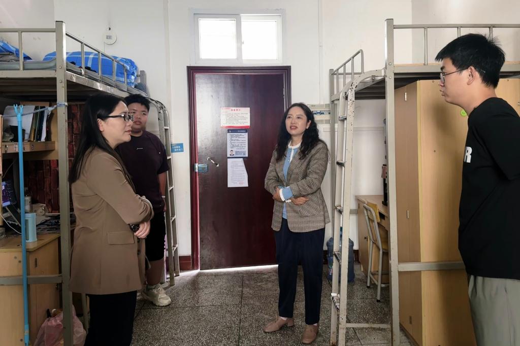 检查期间,陈霞、张姣蓉分别带队深入学生寝室,亲切问候学生,详细了解假期安排、学习生活和未来规划,关切询问寝室相处状况,倾听学生诉求、解答疑惑,传递学院关怀与温暖。