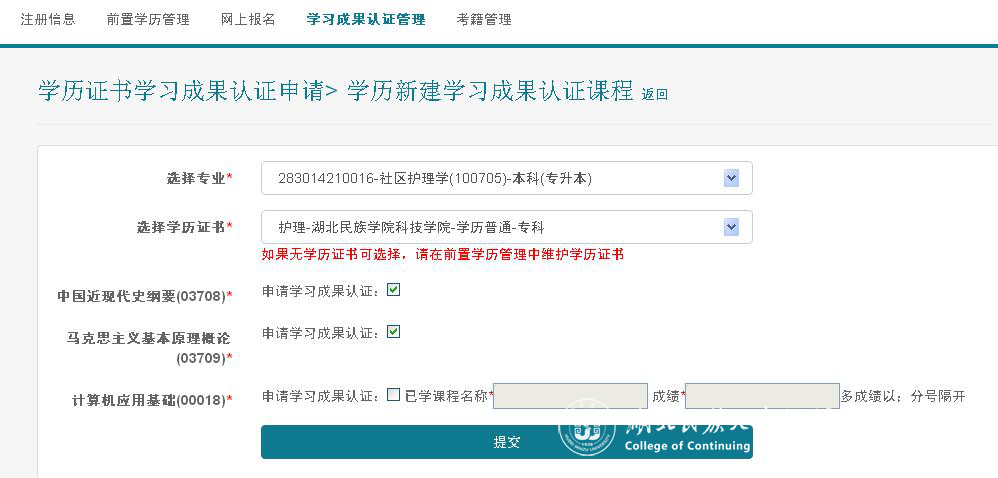 以下页面03708《中国近现代史纲要》、03709《马克思主义基本原理概论》后面打勾,计算机应用基础不用点!!!,点击提交即可通过。