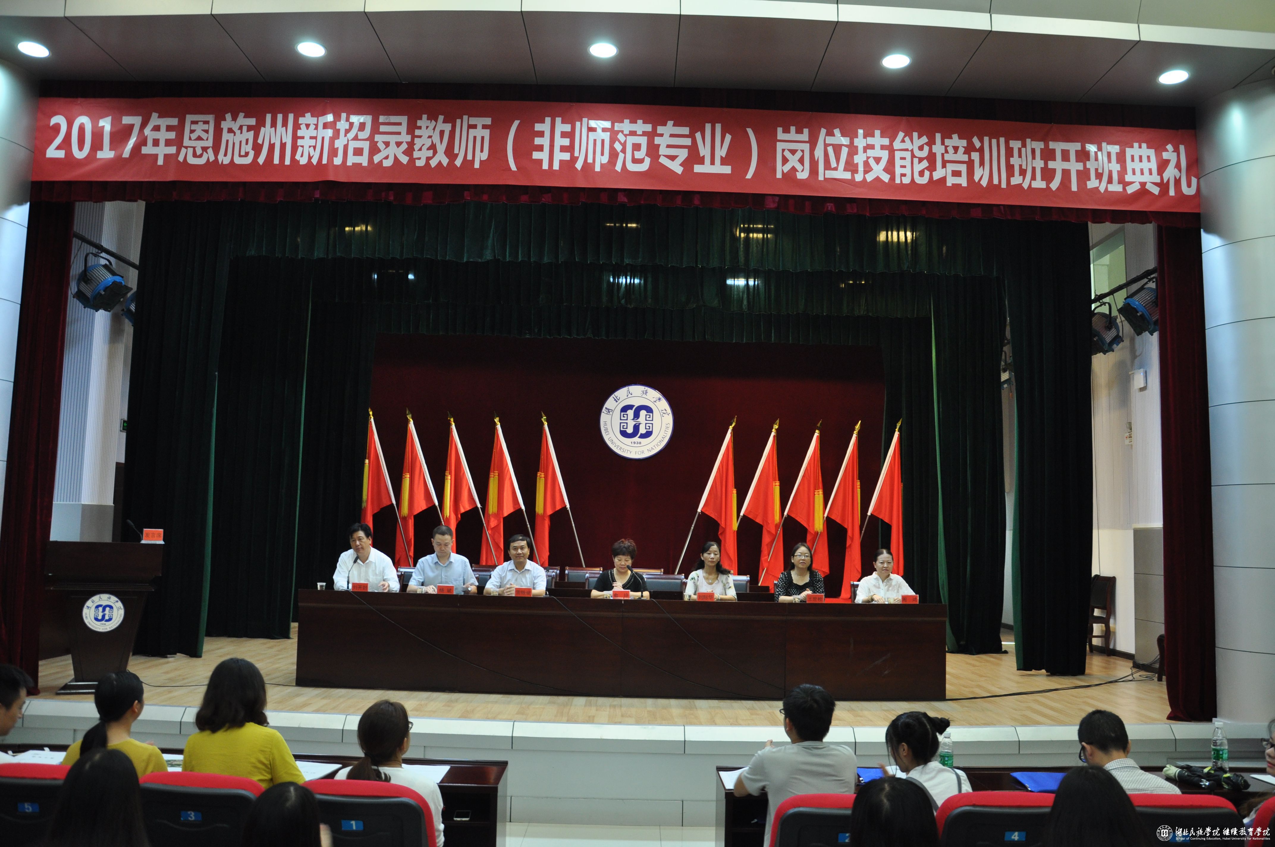 本网讯(通讯员 杨斌 魏兴奎)2017年恩施州新招录教师(非师范专业)岗位技能培训班开班典礼于9月7日上午在我校行政楼一号会议室举行。州教育科学研究院副院长俞玲,教育学院党总支书记刘际华、院长雷随斌、副院长王世枚、非学历教育管理科工作人员及全体学员参加了典礼。典礼由教育学院副院长刘开封主持。