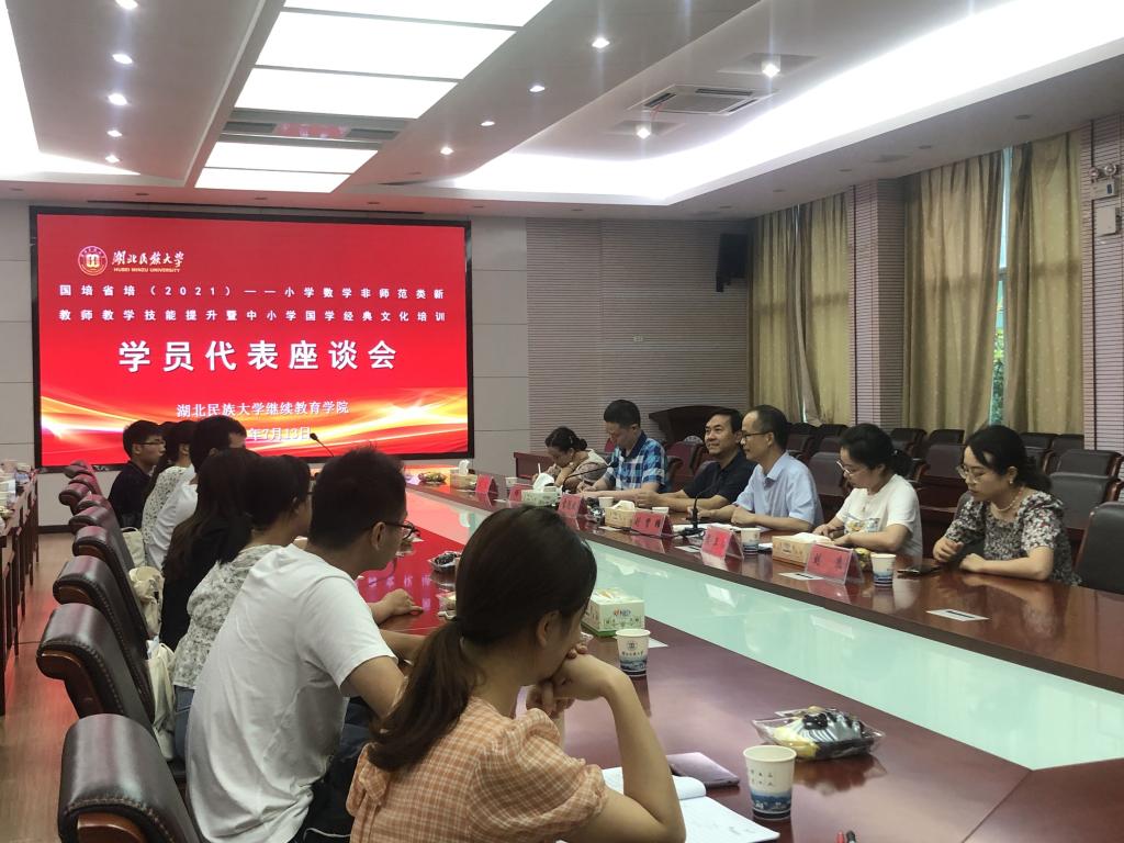7月13日晚,我院组织召开国培省培(2021)——小学数学非师范类新教师教学技能提升暨中小学国学经典文化培训学员代表座谈会。院长雷随斌、副院长刘贤锋出席,本期两个培训班的40名学员代表、班主任及考试培训科工作人员参加座谈会。