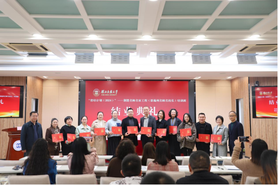 (来源:考试培训科 审核:刘贤锋) 11月12日,“省培计划(2023、2024)”——荆楚名师名家工程(恩施州名师名校长)培训项目结业典礼在我校德智楼远程教学观摩室举行。这标志我校承训的该项目圆满结束。365电子娱乐官方网站继续教育学院来国红院长、刘贤锋副院长出席典礼。典礼由继续教育学院考试培训科杨斌科长主持,47位名师名校长学员和项目组工作人员参加典礼。