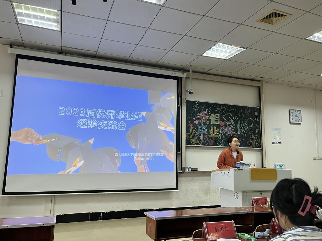 本网讯(通讯员 张诗雪)5月25日下午,教师教育学院在9B110教室举行了2023届优秀毕业生经验交流会。毕业生代表彭不凡、张琪、李康悦萌、莫继园和双小雨等同学、教师教育学院大一和大三学生以及班主任黄珊珊老师参加了此次交流会。