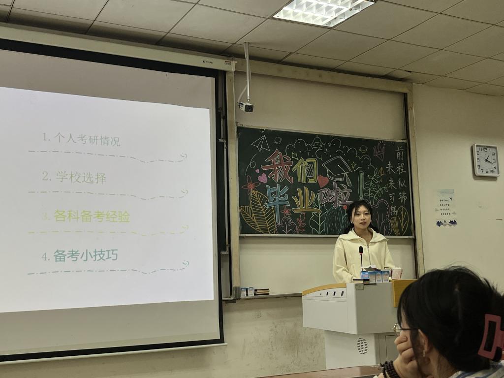 在会议上,毕业生代表们将自己的学习和实践的经验分享给了学弟学妹们。彭不凡总结自己的成功经验,鼓励学弟学妹们再苦再累也不要放弃,在任何时候要相信自己;张琪分享了考公上岸的经验,告诉学弟学妹们“要做好选择,不能局限自己,在过程上努力,在结果上随缘,你就一定会有所收获”;成功考上研究生的李康悦萌、莫继园和双小雨从考研备考、初试和复试等方面交流了自己的心得体会,提醒要考研的同学们要提前选择考研的学校并分享了选择的技巧和方法,最后给同学们分享了针对不同科目的备考方法。交流会现场气氛活跃,同学们踊跃发言,提出自己在学习和备考中的疑惑,而毕业生代表们解答了同学们在学习中的迷茫与困惑,并提供了自己的想法和见解。