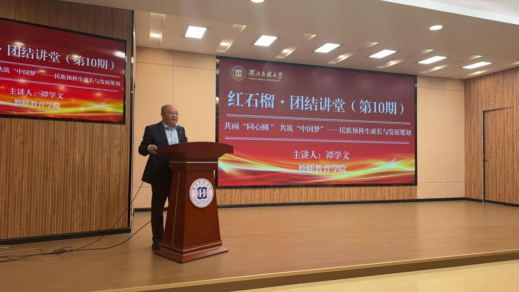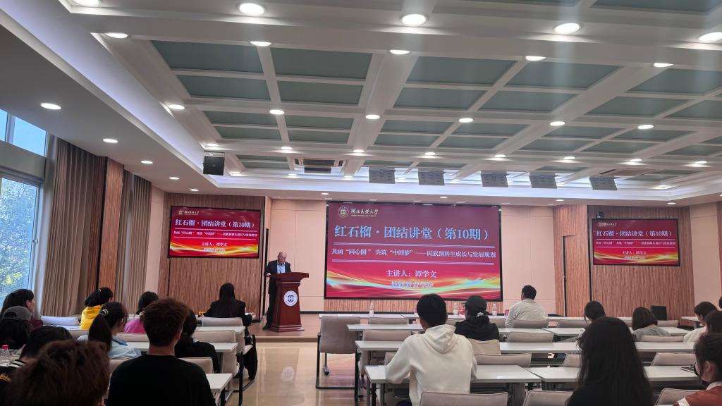本网讯(通讯员 尼沙)10月29日,学院第10期“红石榴·团结讲堂”在德智楼远程观摩厅举行,365电子娱乐官方网站学生工作部民族事务办公室主任谭学文受邀以《共画“同心圆 ” 共筑“中国梦”——民族预科生成长与发展规划》为题作专题讲座。学院全体辅导员、各族学生代表共计200余人聆听了讲座。讲座由辅导员尼沙主持。