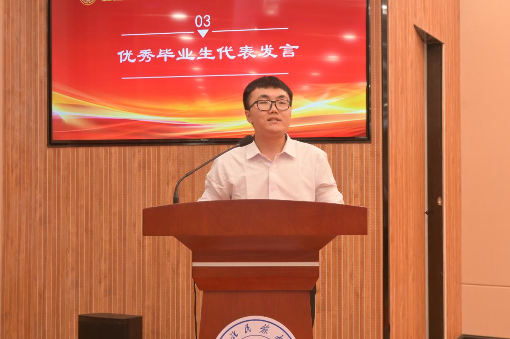 毕业生代表乔昱发言,他深情地回忆了自己大学的成长经历,表达了对老师、同学和母校的感激之情。他表示,正是老师们悉心的引导,让他能够领悟责任与担当,让他能够不断超越自我,更加坚定与从容的走向社会。现在他已成功入选为西藏西部计划的志愿者,在未来的岗位上,他将继续发扬“奉献、友爱、互助、进步”的志愿精神,在西部的大地上绽放青春的光芒。