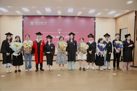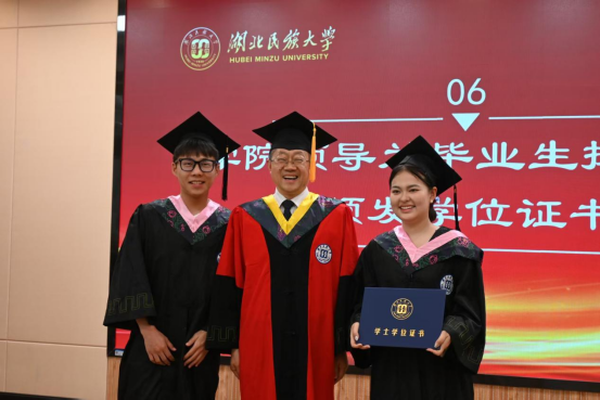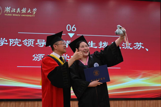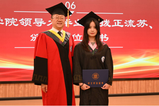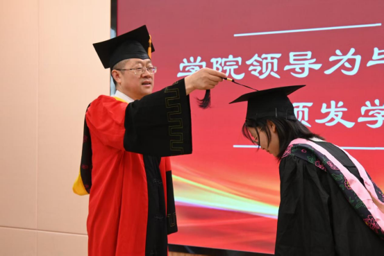 教师教育学院副院长邱世兵宣读获得学士学位学生名单。这一纸证书,镌刻着学子们四载寒窗的求索与成长,承载着青春岁月里的耕耘与荣光。谭世明院长为学生拨正流苏并颁发学位证书。